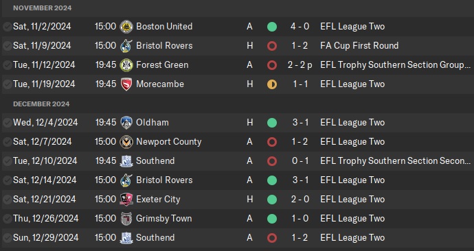 The season started well with a 3-0 victory against Cheltenham and goals from Burke, Cantu, and Matthews. But we would soon go on a terrible league form, losing 7 and drawing 2 out of 11 games from August 24th to October 12th. This included a frustrating 2 goal loss against Aldershot Town, the team we’ve been chasing up the tiers of English football.