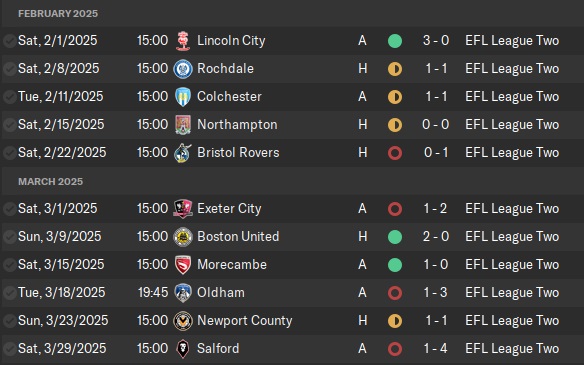 After our wonderful January, we stayed in neutral for two months, allowing Northampton, Salford, and Southend to pass us for the three automatic promotion spots. The loss to Salford especially hurt and demonstrated to us that we were not as good as those teams passing us.