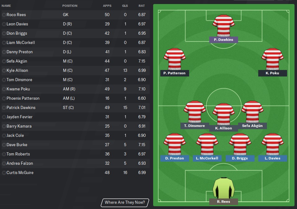 Honestly, I’ve got to hand it to the new club president, Craig Jones. Akgün was a brilliant signing and played consistently well. He was the fans’ player of the year and probably mine as well. Speaking of fans, we averaged 2,800 this year but are still renting The Breyer Group Stadium from Leyton Orient. I have been badgering Mr. Jones for new grounds every opportunity I get but he won’t budge. We may have to rent our home field until the Championship, I guess. And that was our goal now. We finished strong, but we needed to find some better players. Just a few more wins than draws next year and we’ll be in the playoffs.