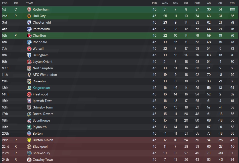We never actually were threatened with relegation but a few more draws like earlier in the season could have easily seen us in the 17/18th range. Instead, a mid-table finish was a nice reward to a frustrating season. That said, I was upset we didn’t manage to climb over AFC Wimbledon by the end, especially when you see our goal differential compared to theirs.