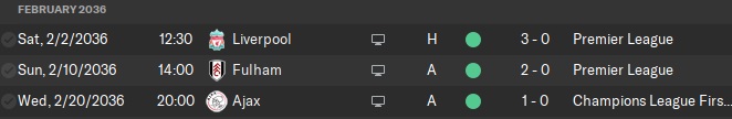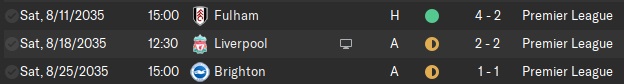 Our win against the weakened Fulham (no Danny Johnson, no Edon Lopes) is now Kingstonian’s sixth straight opening day win. Reynders and Umar get a brace each. Reynders scored a goal in the next two games too, which includes an impressive draw against Liverpool on the road. Liverpool’s Dutch legend, Alexander Lemmens, gets on the scoresheet against us again; I’m going to be so happy when he retires. But at 33, he still has a few years of bothering us to go.