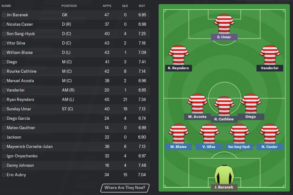 Check, check, check. Rourke Cathline looks like Danny Johnson-lite but with striker qualities too. He looks fantastic and slots perfectly into the midfield with the other youngsters, Igor and Diego. Manuel Acosta heads to the bench as he has maxed out his potential, while Kurtis Butler, Alessandro Marotta, and Radim Ditmar are sold at a premium to afford all of the incomings and make room for the younger midfielders.