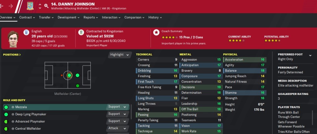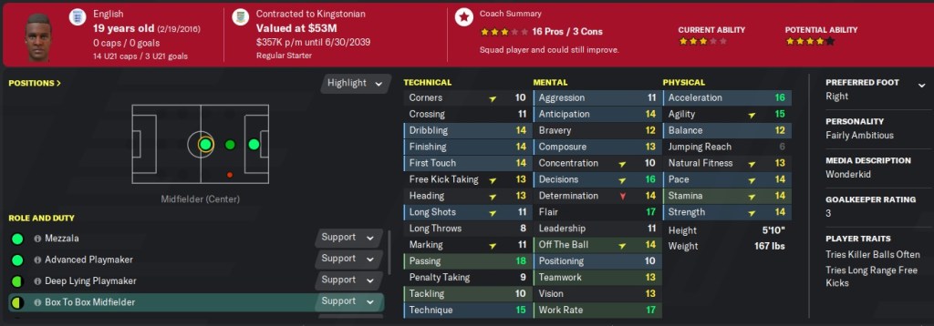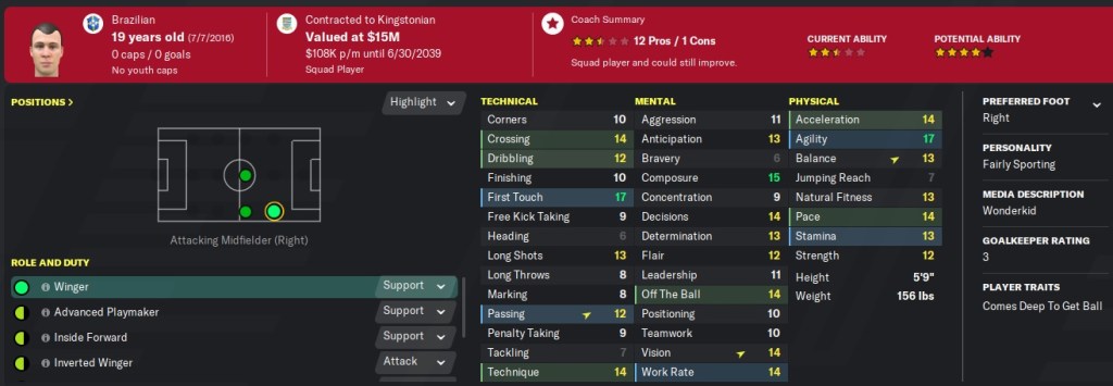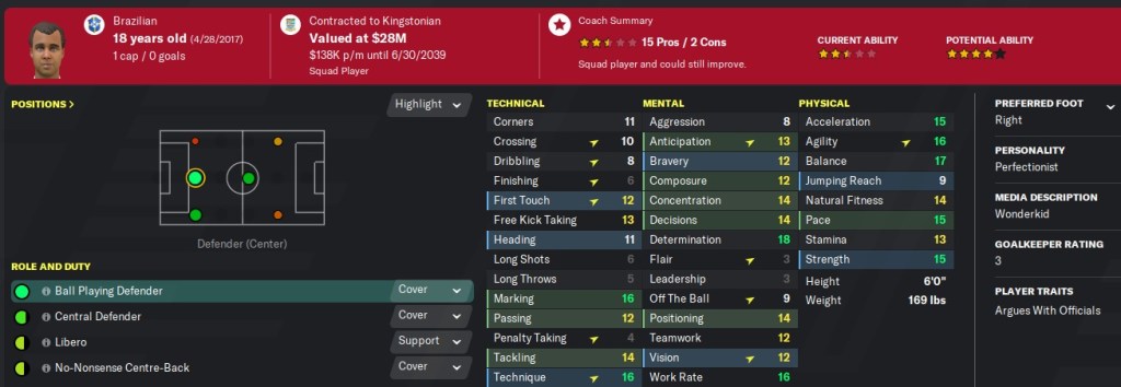 While I have central defender stats highlighted, I actually think Jackson can play well in a right wingback role behind Nicolas Casier. I plan on playing him there and seeing if his dribbling and crossing can improve. If not, he’ll stick at central defender.