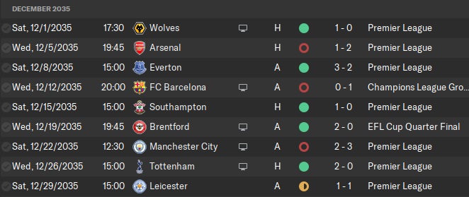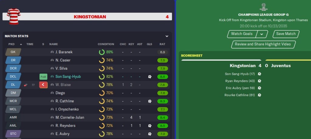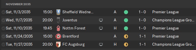 I don’t even know how to explain our 1-0 win away at Juventus. It should have been a draw. But in the 89th minute, Igor found himself unmarked just outside the box and struck the ball into the bottom right corner. An unbelievable 12 points after 4 games in a group with Juventus and Barcelona. After already qualifying for the next round, we took it easy against Augsburg and drew 1-1. This was hot on the heels of a disappointing draw at Brentford where Maverick was injured and would be out for a month, so I had a feeling our form was starting to falter.