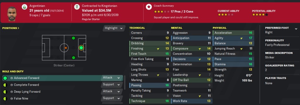 Diego Garcia enters with a lot of similar characteristics to Eric Aubry. He came with high recommendations from my scouts and just look at the summary – 17 pros! I’m a little nervous his finishing isn’t good enough for a 21 year old but maybe he will advance more with the higher competition of the Premier League.