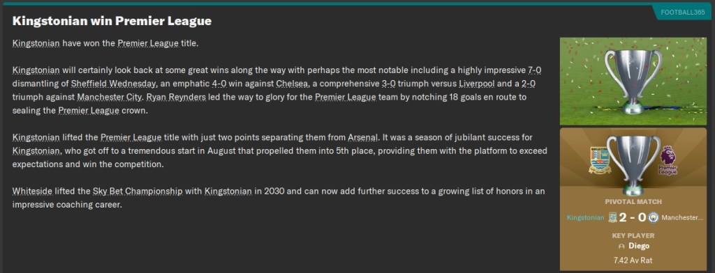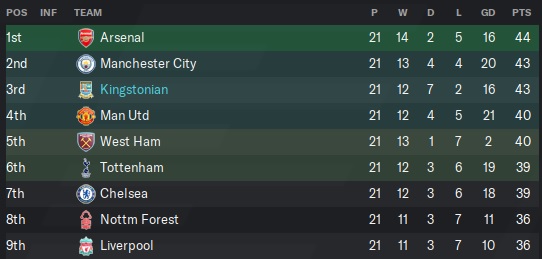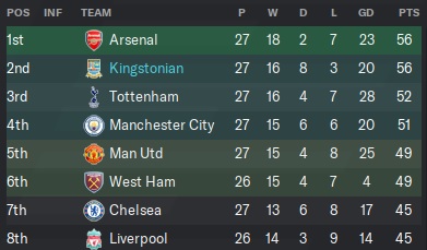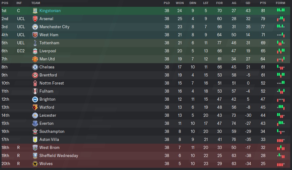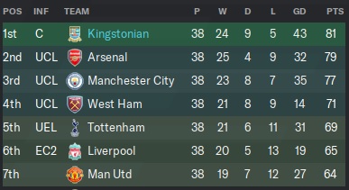 The pictures tell the story. Kingstonian has won the Premier League! Not even Arsenal, Chelsea, or Tottenham won the Premier League since this campaign began and yet here we are, the kings of England! I am dazed, confused, bewildered, ecstatic, and a whole mix of emotions between happy and amazed. It was definitely the year to do it considering that City dropped off and the competitiveness in the league was fierce. Just take a look at the final table.