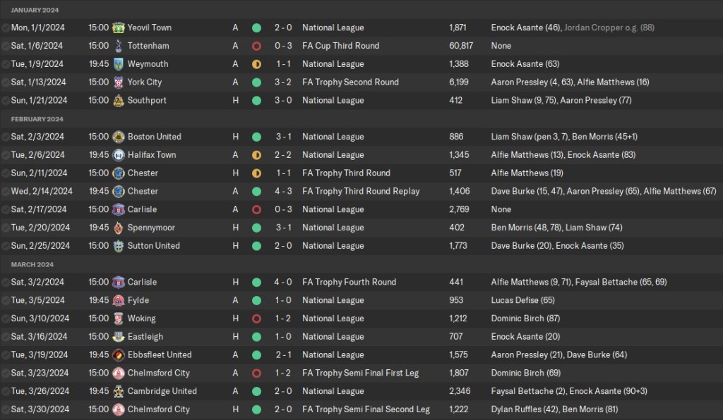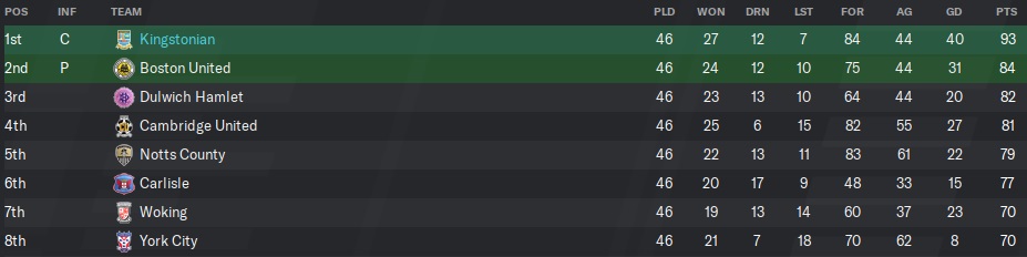 I haven’t even mentioned the lifeless draw against AFC Wimbledon at home yet. Which, funnily enough, was actually a successful result! By the end of November, AFC Wimbledon was flying with 42 points and had been in the top 4 the entire season. Gabrielle Cioffe, the AFC Wimbledon head coach, had not taken too kindly to some of the words I said about him and his team to the media during the stretch run last season. Cioffe was constantly smearing me during the start of this season, saying Kingstonian was a favorite to be relegated. He was also quite pompous about his stellar start. Which ultimately was unfortunate for AFC Wimbledon as he left them at the end of November for the Championship side, Bristol City. The team crumbled without Cioffe, accumulating only 24 points the rest of the season, finishing 11th.